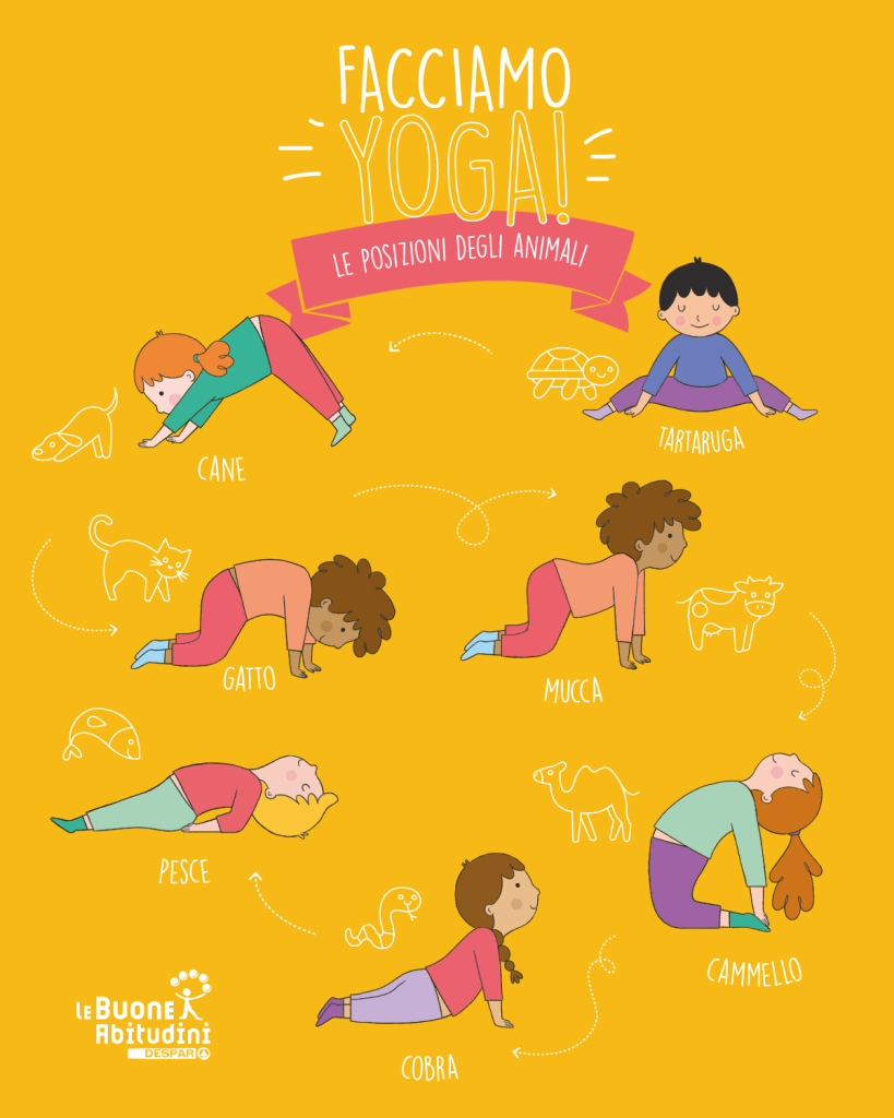 Sono molte le posizioni dello yoga (asana) che prendono spunto dai movimenti degli animali e dalle forme degli elementi esistenti in natura. E, come immaginerete, sono le posture più amate dai più piccoli. Questo perché i bambini possono immedesimarsi in qualcosa che già conoscono, per esempio immaginando di essere un gatto che si stiracchia, un alberello del giardino di casa, un pesciolino che nuota nel mare.
