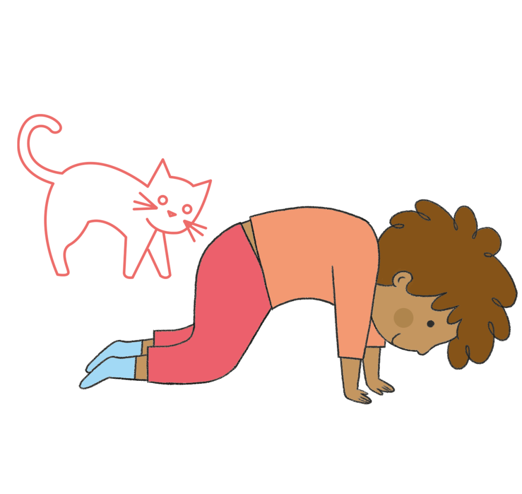 Piega le ginocchia e appoggiale a terra, tornando a quattro zampe. Fai attenzione che le ginocchia siano alla stessa larghezza dei fianchi, le braccia dritte e perpendicolari alle spalle, e la testa in linea con la colonna. Ora abbassa la testa portando il mento verso il petto, poi solleva lentamente la schiena verso l’alto fino a formare una gobba. Mentre distendi la colonna, spingi il più possibile l’ombelico verso l’alto e tieni le spalle ben lontane dalle orecchie.