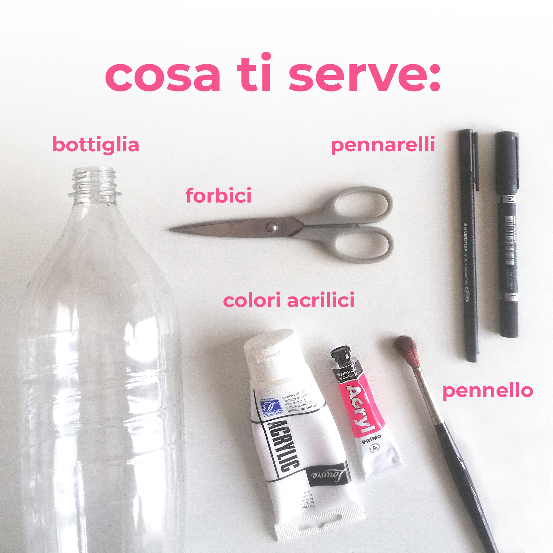 bottiglia di plastica, forbici, pennarelli neri, colori acrilici, pennello.