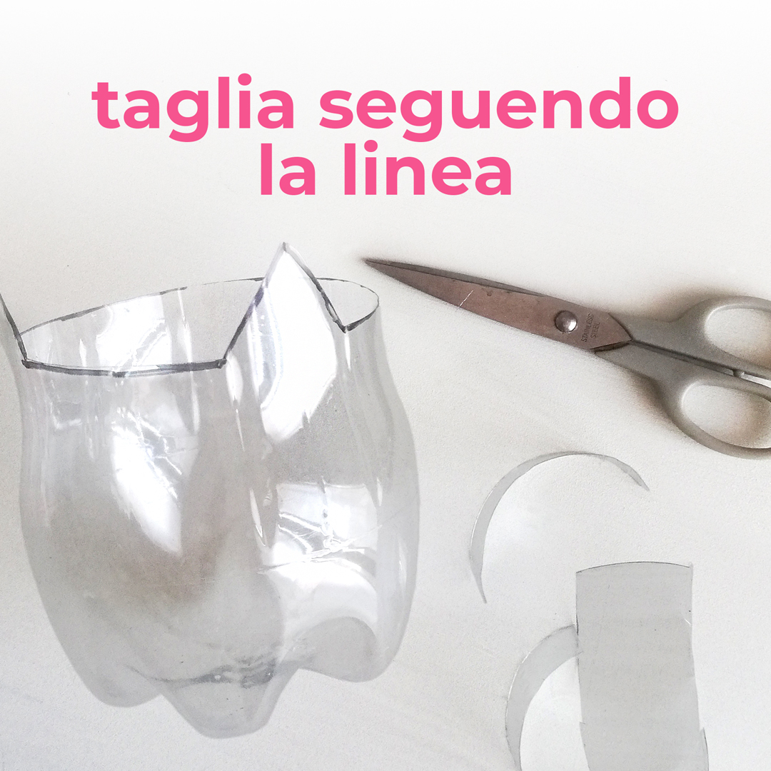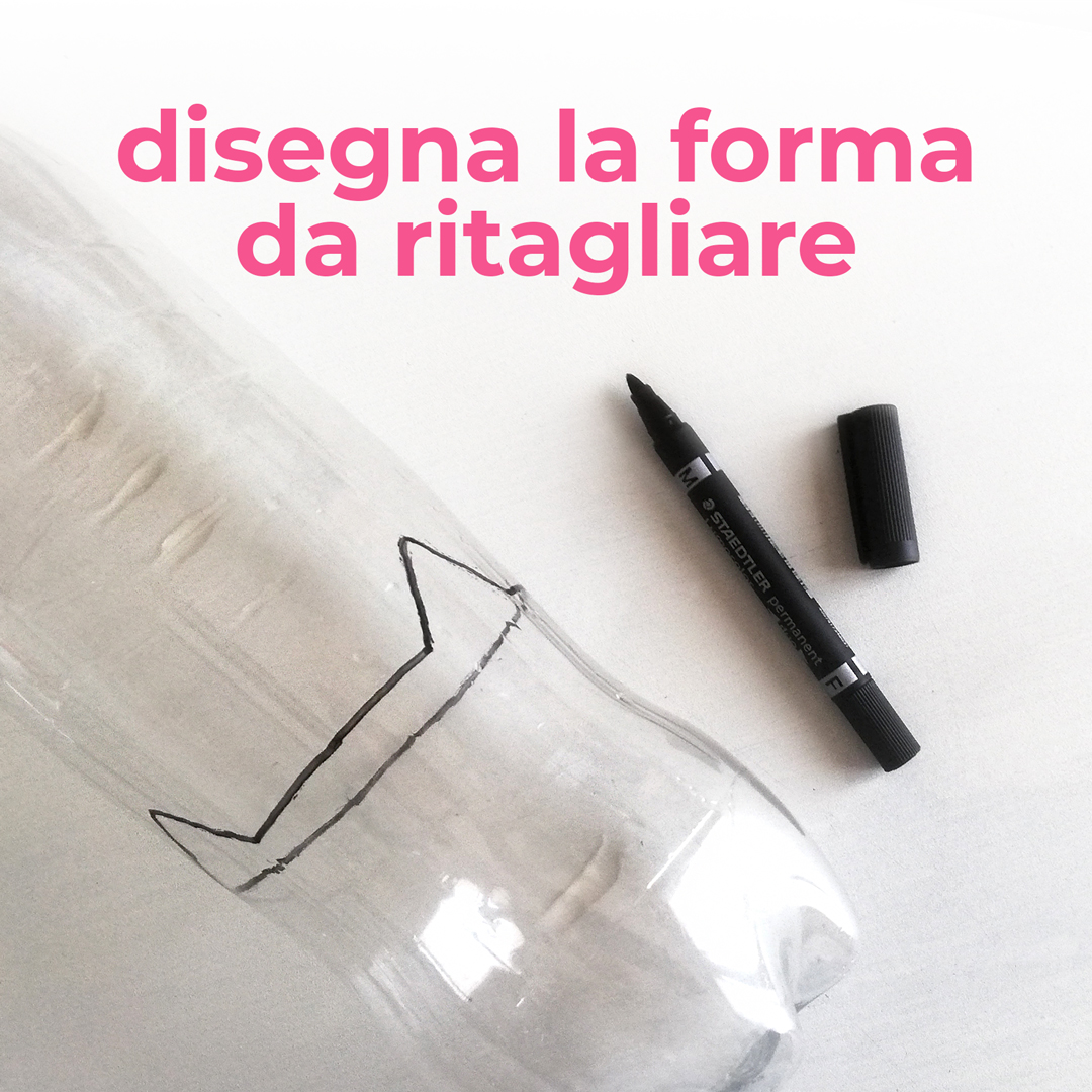1. Con un pennarello, disegna sulla bottiglia la forma dell’animaletto che vuoi realizzare, poi ritaglia seguendo la linea.