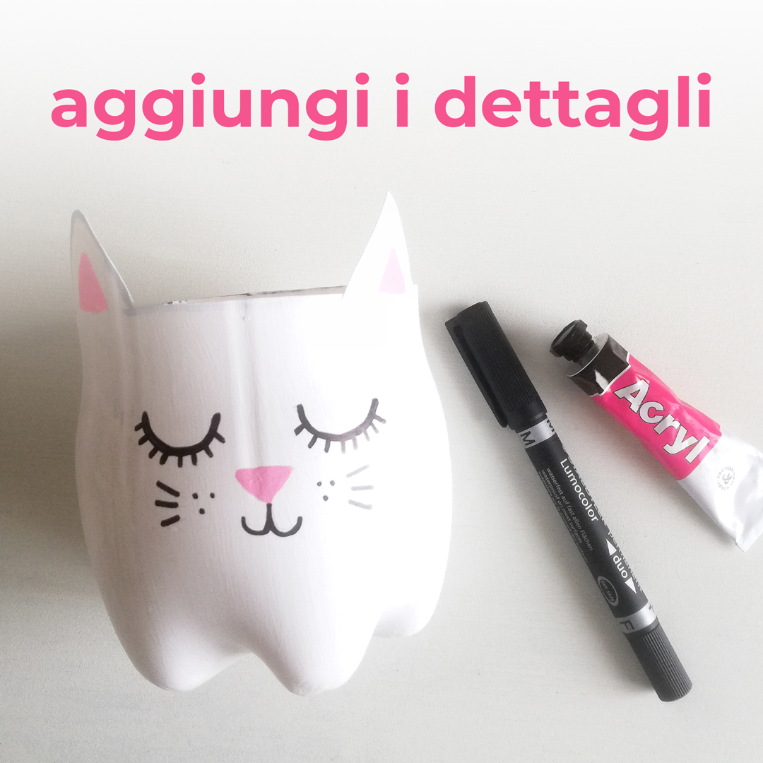 3. Con un pennarello nero indelebile, aggiungi i dettagli dell’animaletto che hai scelto (occhi, bocca, baffi…); poi, con del colore acrilico rosa, disegna le orecchie e il naso.