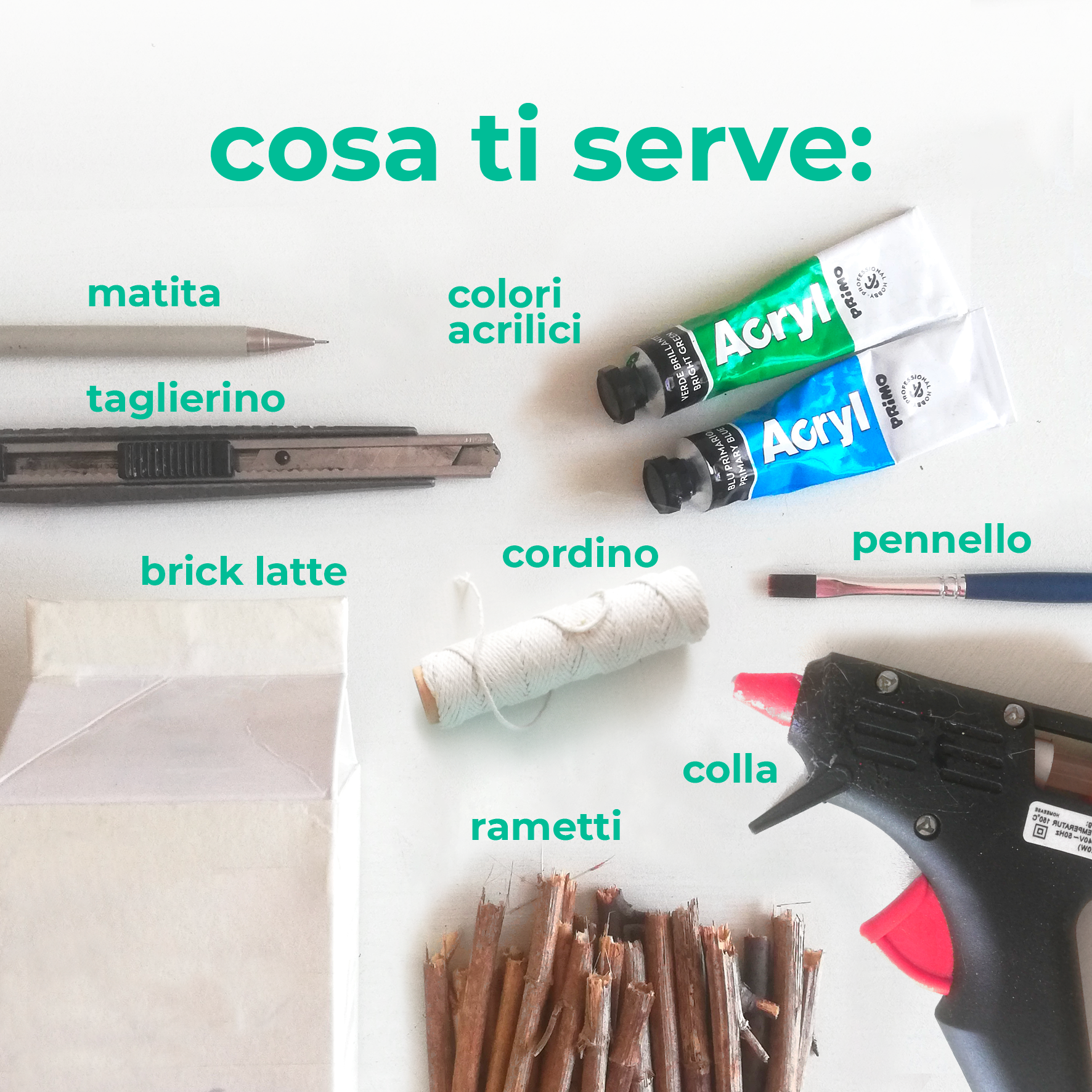 brick del latte (o altra bevanda), rametti, cordino, colori acrilici, pennello, colla a caldo o vinilica, taglierino o forbici, matita.