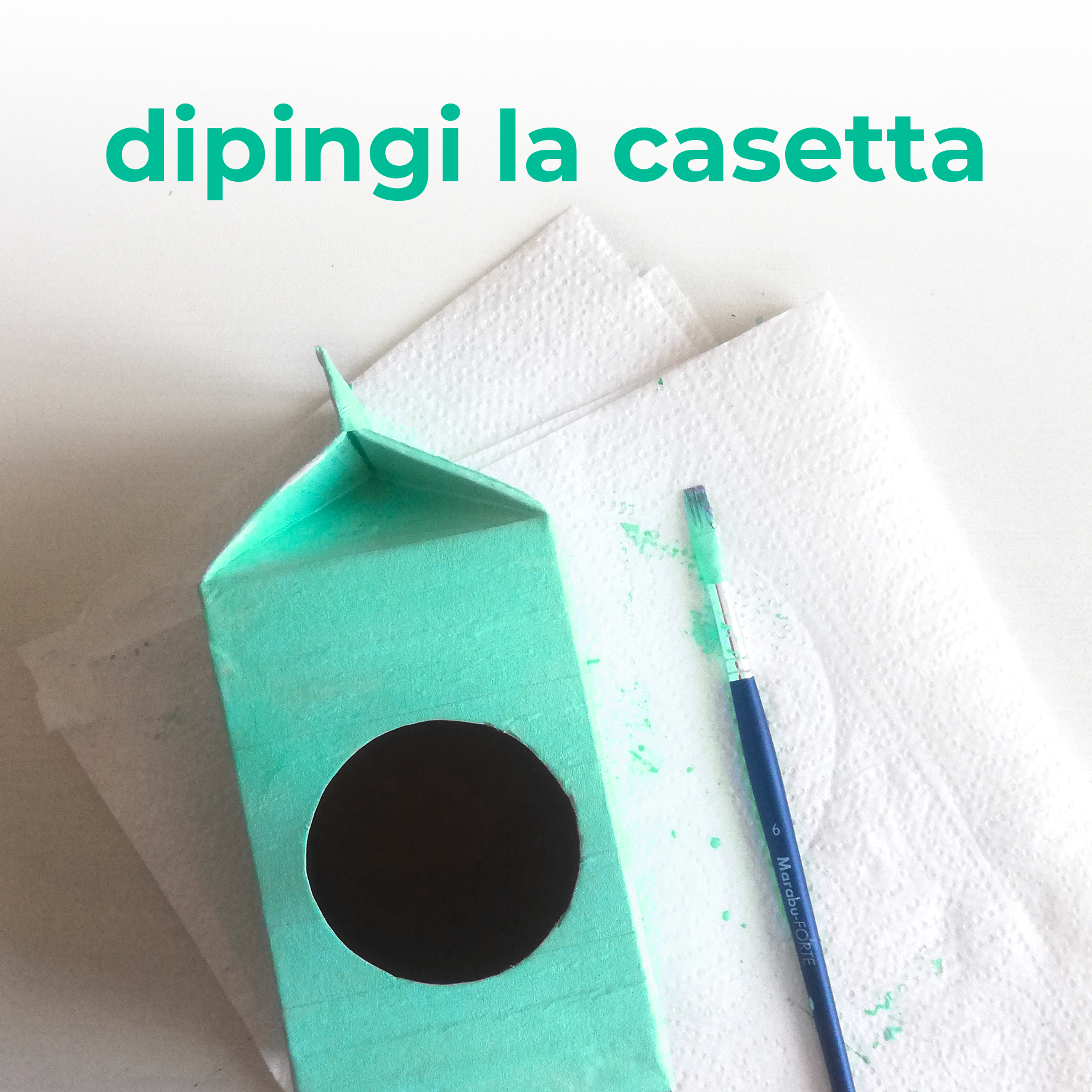 1. Lava bene il cartone del latte e chiudi i beccucci fissandoli con un po’ di colla. Poi, disegna e ritaglia l’ingresso della casetta: noi abbiamo disegnato una finestra circolare, ma puoi farne una rettangolare aiutandoti con un righello.