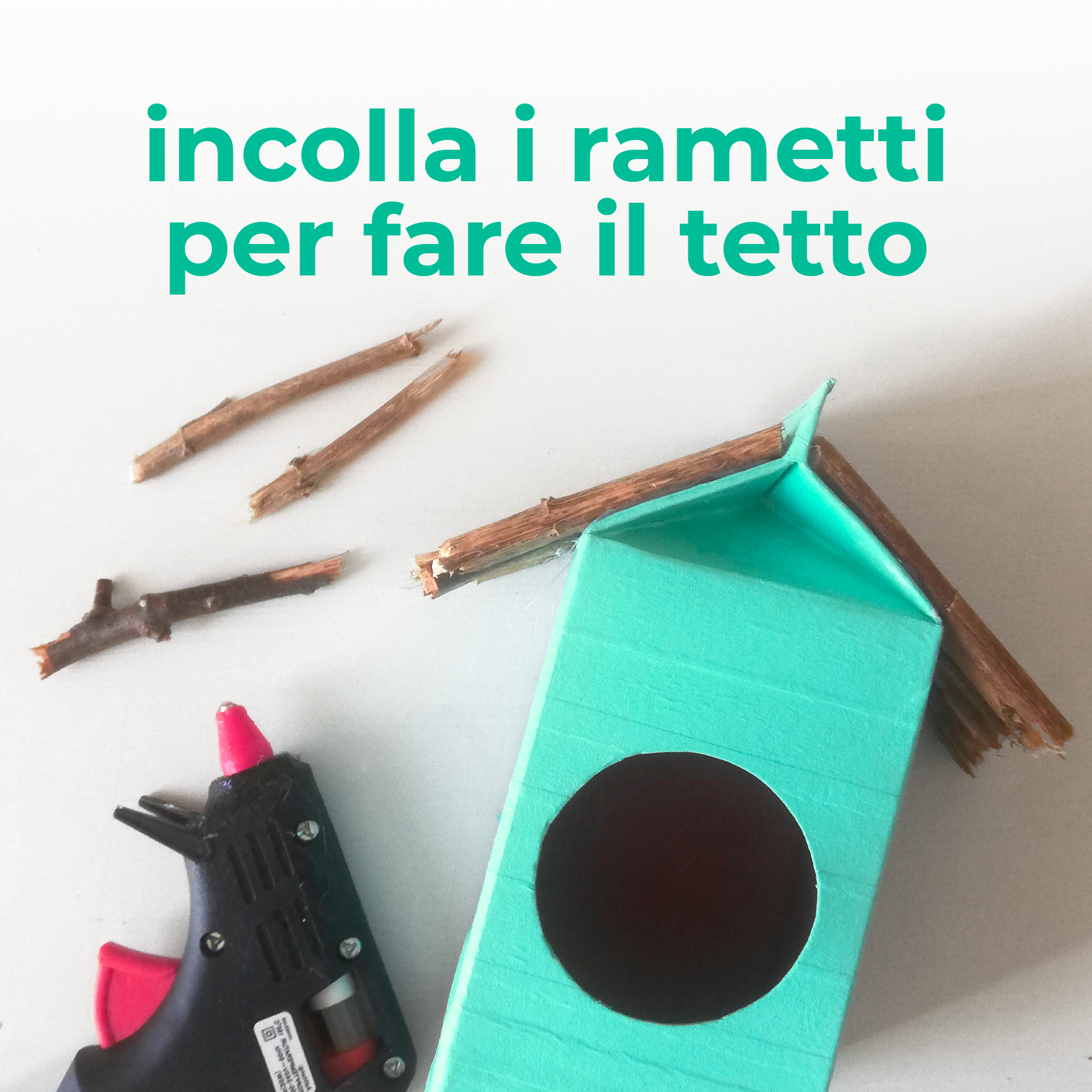 3. Spezza i rametti facendo in modo che siano tutti della stessa lunghezza, poi incollali sul cartone del latte per creare il tetto, utilizzando la colla a caldo o, in alternativa, quella vinilica.