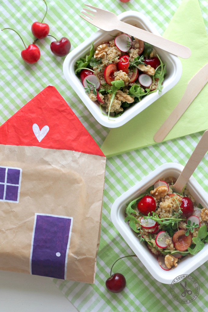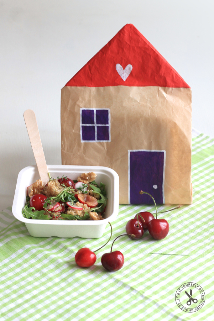 3. Prepara i tuoi kit da pic-nic: per ogni persona ti serviranno una ciotolina o un piatto, un bicchiere, posate e tovagliolo! Componi il tutto e inserisci all’interno del sacchetto, piega gli angoli sul retro e fissali con un pezzetto di nastro adesivo di carta!