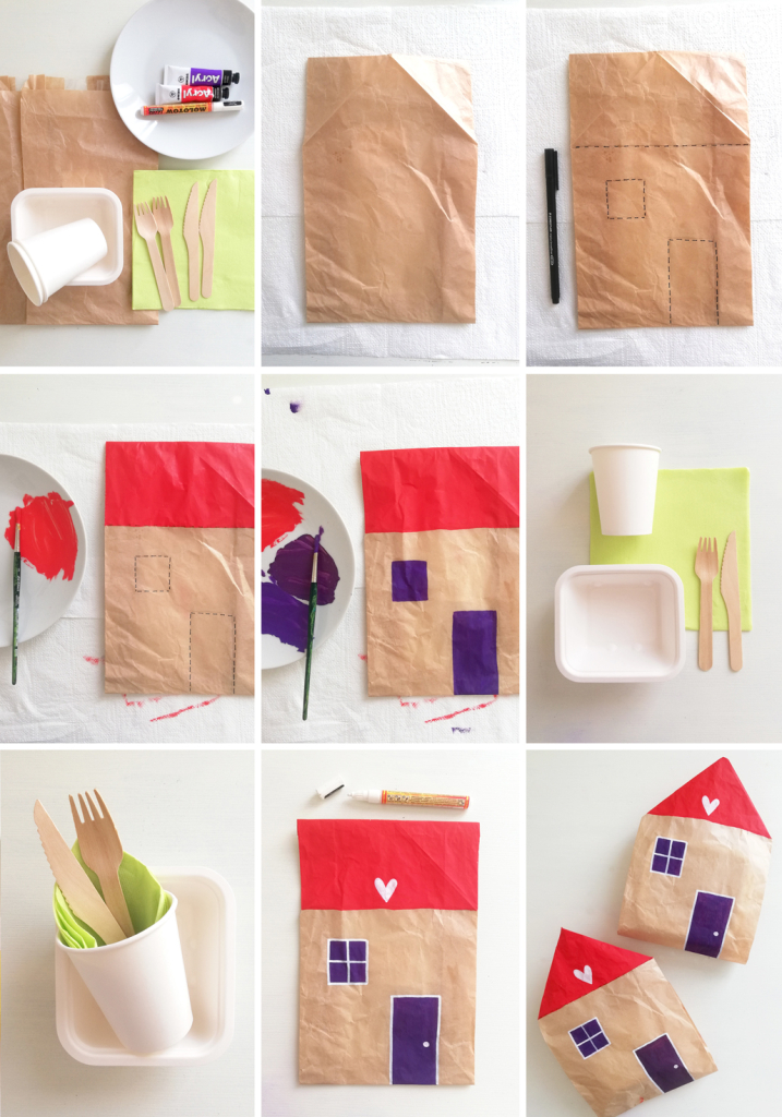 sacchetti di carta, ciotoline di carta, bicchieri di carta, posate di legno usa e getta, tovaglioli di carta, colori acrilici, pennarello bianco, nastro adesivo di carta, piatto per i colori, pennello, matita.