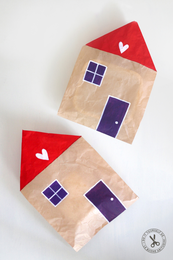 1. Piega gli angoli del sacchetto di carta per dare la forma di una casetta, premi bene sulle pieghe perché rimanga il segno. Disegna poi i contorni di tetto, porta e finestra.