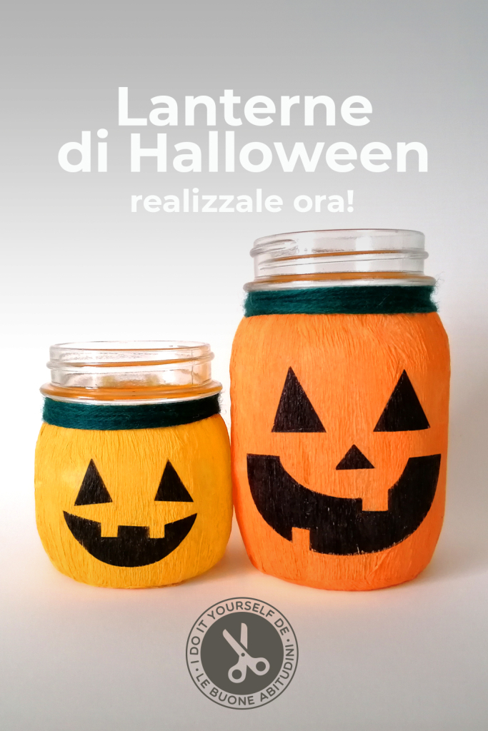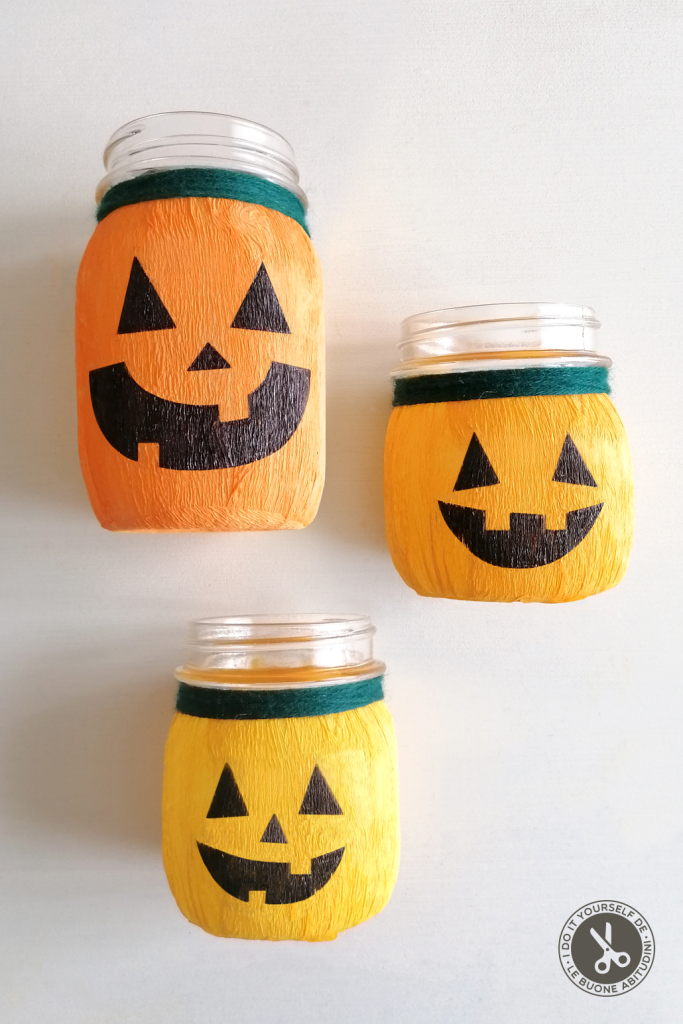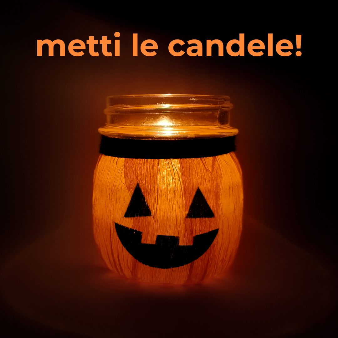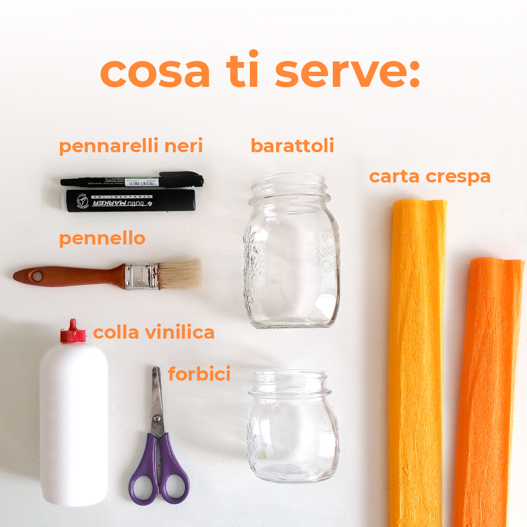 Barattoli in vetro (di diverse forme e dimensioni), carta crespa arancione, colla vinilica, forbici, pennello di medie dimensioni, pennarelli neri indelebili. Facoltativo: candele, filo di lana.
