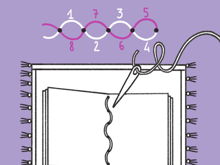 Posiziona il libretto aperto su un panno spesso e fora i punti con un ago da lana, poi cuci con un filo da ricamo colorato fissando bene i fogli tra loro.