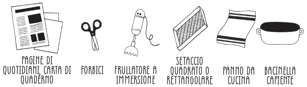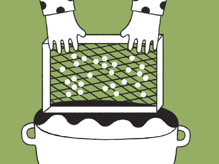Immergi il setaccio nella bacinella e raccogli la poltiglia, poi muovi il setaccio per distribuirla e togliere l’acqua in eccesso.