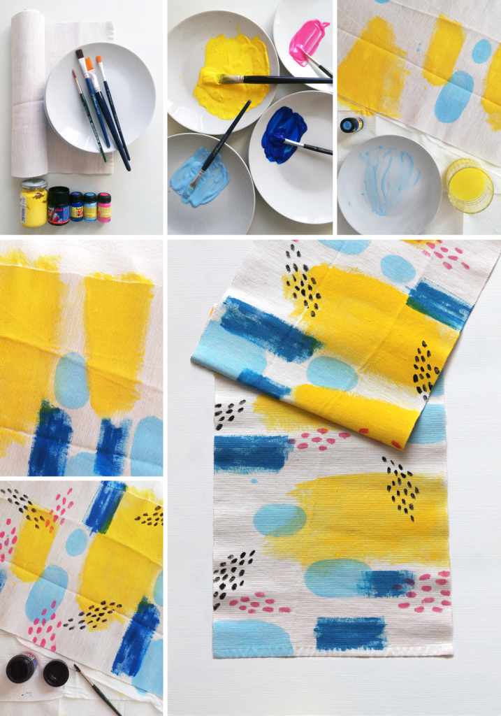 runner di stoffa per la tavola (noi abbiamo scelto un runner di colore chiaro), 4 o 5 colori da tessuto pronti all’uso, pennelli di larghezze diverse, piatti, carta assorbente o di giornale.