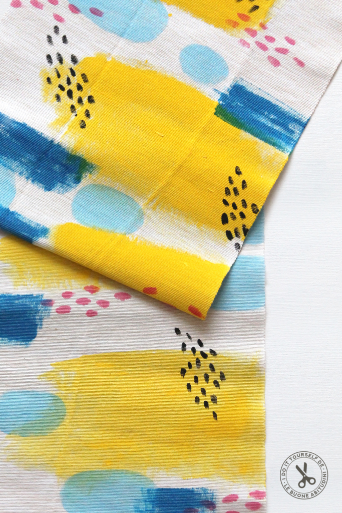 2. Inizia a dipingere delle forme astratte con i colori principali (quelli che si vedranno di più una volta finito il runner). Ti consigliamo di fare le forme più grandi sempre con lo stesso colore, e alcune forme più piccole di uno o due colori diversi.