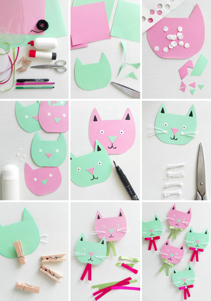 4. Taglia il nastro colorato per realizzare i fiocchi, per ogni gatto ti serviranno due pezzetti lunghi 2 cm e uno lungo 6 cm. Incolla sulla parte scoperta della molletta i due pezzi corti, componi il fiocco con il pezzo più lungo e fermalo con del nastro biadesivo. Puoi completare il fiocco con un cerchietto di cartoncino colorato!
