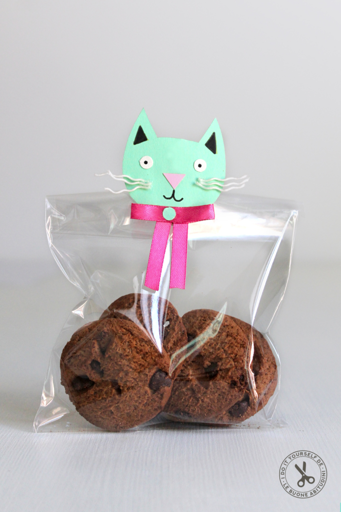 1. Taglia dei quadrati di cartoncino di 6 cm per lato, te ne servirà uno per ogni sacchettino. Disegna la sagoma di un gatto su uno dei quadrati e poi ritagliala, procedi per tutti i cartoncini.