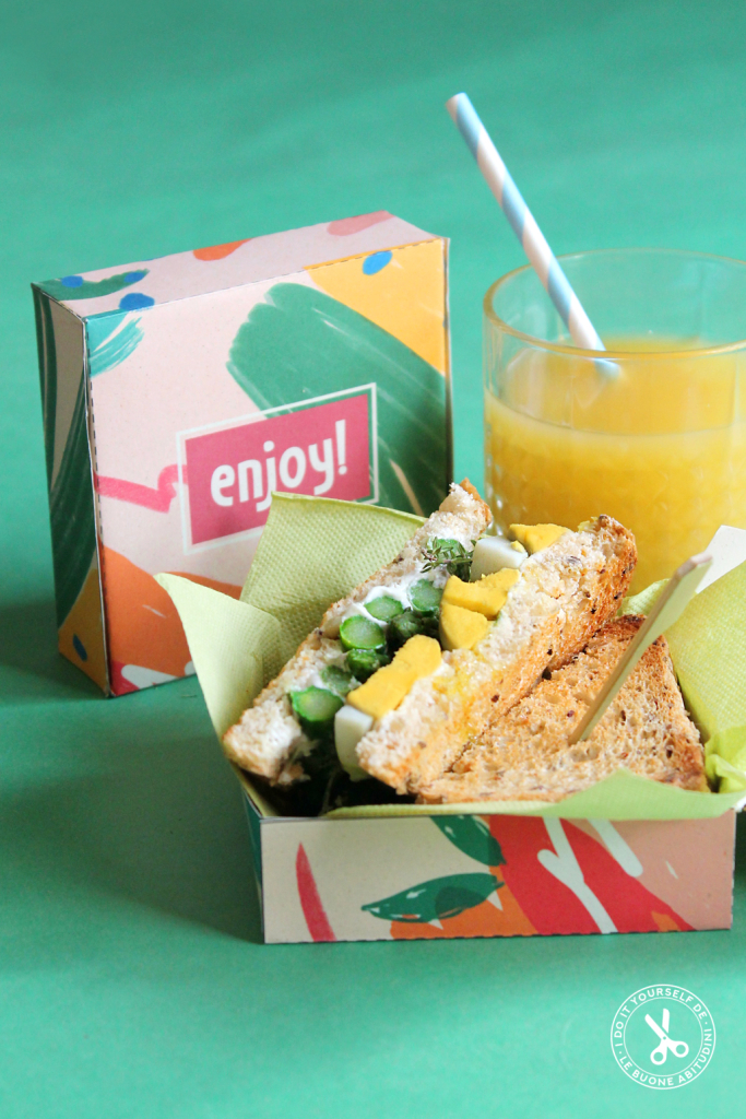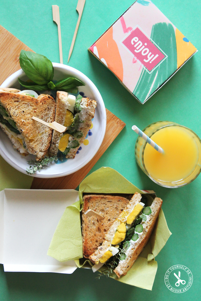 sandwich uova e asparagi serviti nelle loro scatoline personalizzate.