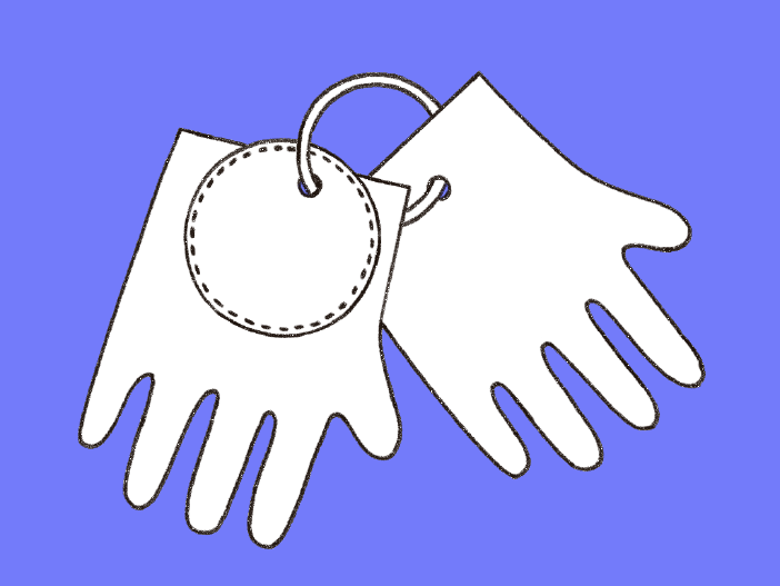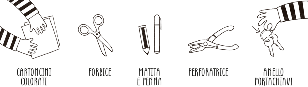 Fai un buco con la perforatrice su tutte le manine e uniscile, insieme al tagliandino, con l’anello portachiavi.