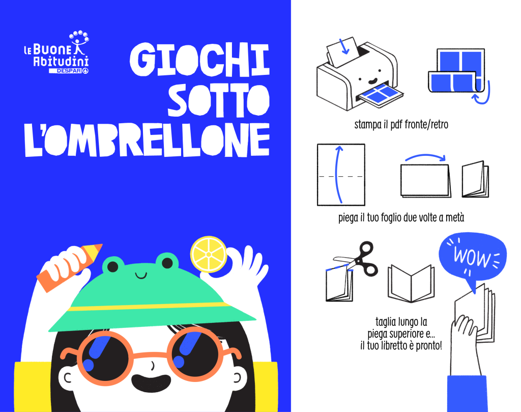 Le buone abitudini non vanno in vacanza e ti accompagnano ovunque tu vada con il nuovissimo libretto GIOCHI SOTTO L’OMBRELLONE, dove puoi trovare tanti giochi per imparare (anche in inglese), enigmi da risolvere, ricette sane e altre attività per rendere il tempo libero un tempo di qualità!