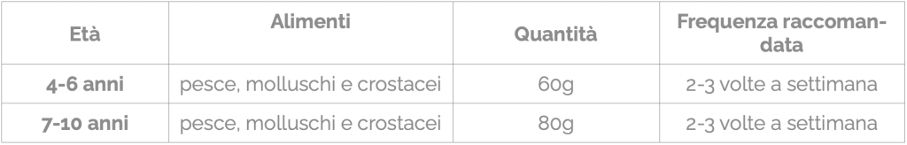 È importantissimo che i bambini di tutte le età consumino regolarmente pesce, in quanto fornisce proteine di ottima qualità ed è fonte di acidi grassi essenziali che il nostro organismo non è in grado di produrre. In particolare il DHA (acido docosaesaenoico) e l’EPA (acido eicosapentaenoico), omega-3 contenuti solo nel pesce, sono fondamentali nel periodo fetale e nell’allattamento (derivano dall’alimentazione della madre), nei primi anni di vita e durante tutta la crescita per il corretto sviluppo della funzione visiva e del sistema nervoso. Nella fase di accrescimento, gli acidi grassi omega-3 si rivelano anche protettivi verso i potenziali fattori di rischio per le malattie cardiovascolari. Inoltre, recenti studi hanno evidenziato uno stretto legame tra gli omega-3 provenienti dalla dieta e il buon funzionamento del sistema immunitario.