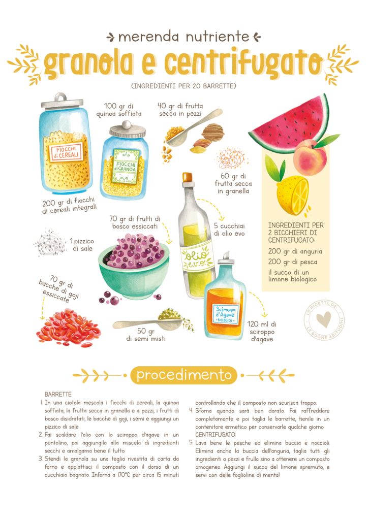 Insieme alle barrette, puoi abbinare un centrifugato a base di frutta e verdura di stagione. Per l’estate ti proponiamo di utilizzare l’anguria e la pesca, dolcissime e amate da tutti i bambini, per le altre stagioni consulta il nostro calendario della stagionalità.