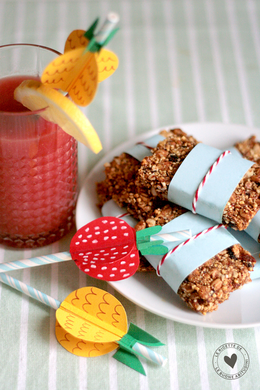 Cosa preparare per merenda ai bambini? Ecco una soluzione sana e super nutriente, ottima per uno spuntino di metà mattina o metà pomeriggio, anche dopo lo sport: le barrette alla granola, accompagnate da un dissetante centrifugato a base di frutta.