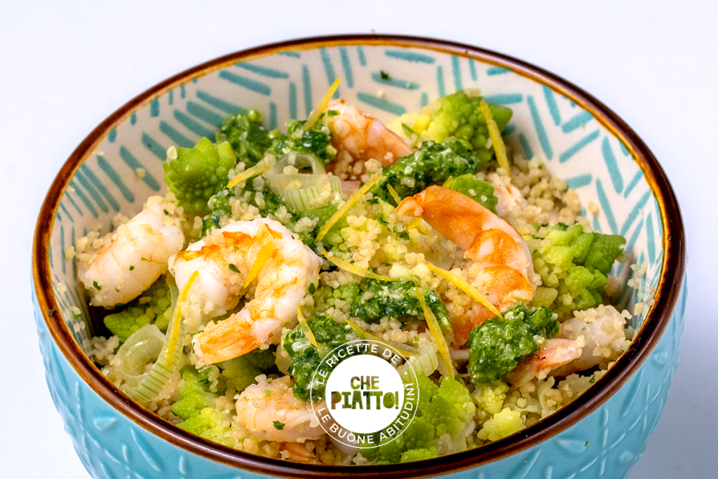 Passate le feste ecco una ricetta equilibrata, gustosa e leggera, in cui sono rispettate tutte le proporzioni del Piatto Unico: 50% di verdure (broccolo romanesco), 25% di fonti di carboidrati complessi (cous-cous integrale), 25% di fonti proteiche (gamberetti) e, per concludere, i grassi buoni (olio extra vergine di oliva e pinoli).