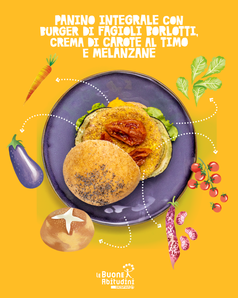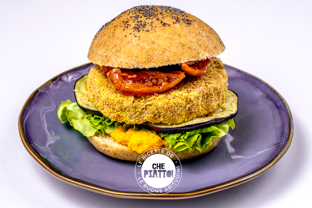 Panino integrale con burger di fagioli borlotti, crema di carote al timo e melanzane