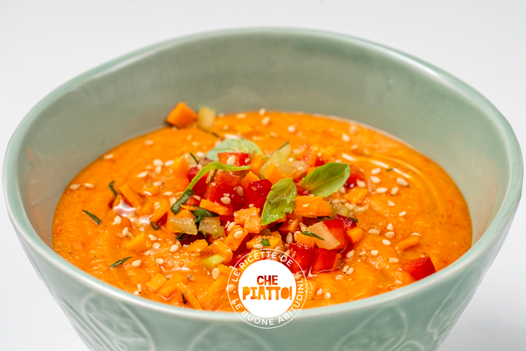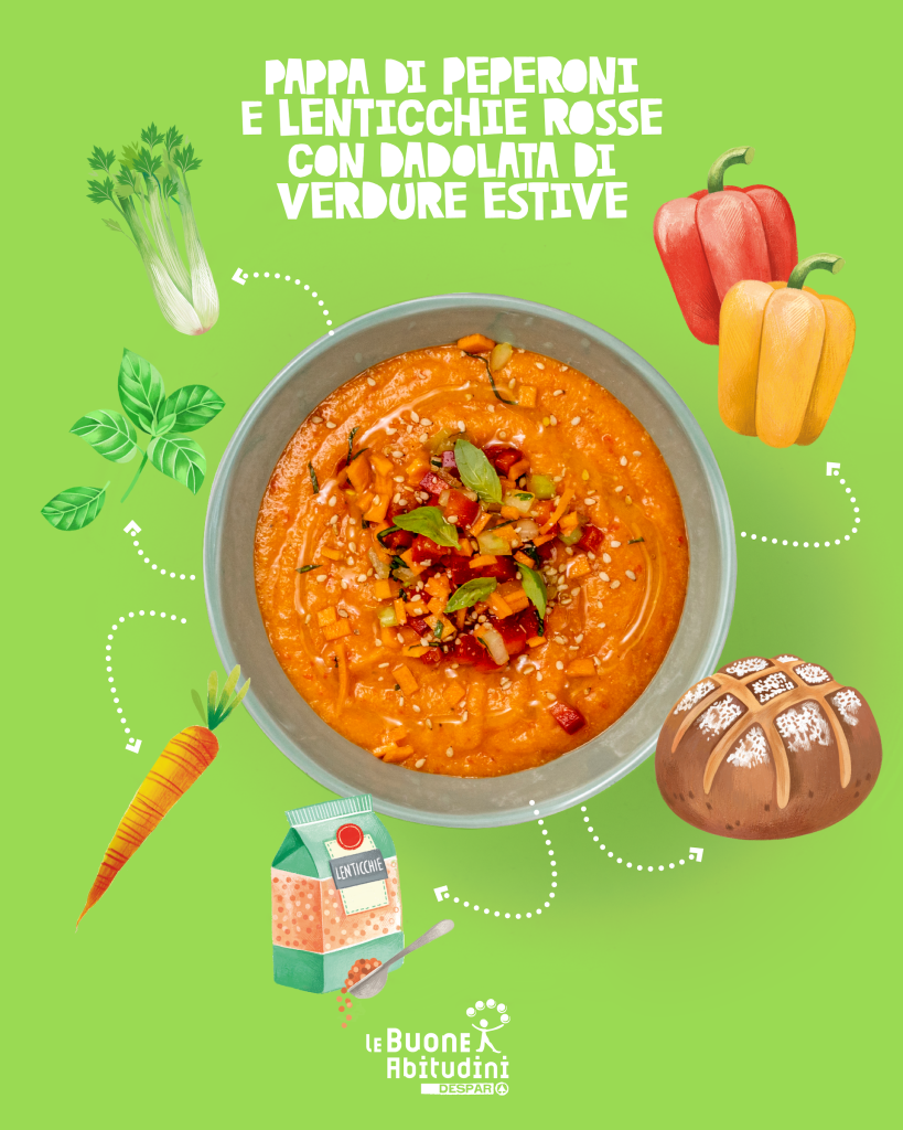 Pappa di peperoni e lenticchie con dadolata di verdure estive